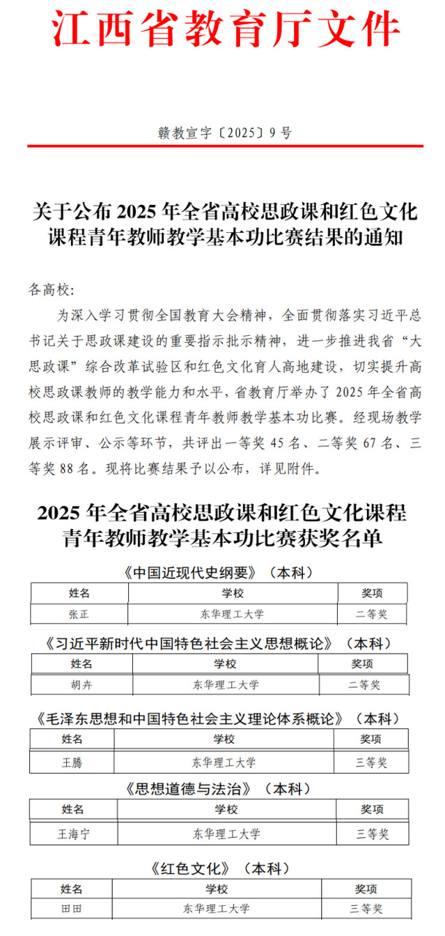 近日,由中共江西省委教育工委、江西省教育厅举办的2025年度全省高校思政课和红色文化课程青年教师教学基本功比赛结果公布,欧宝app官方版web站登入荣获二等奖2项、三等奖3项。其中,张正和胡卉分别荣获《中国近现代史纲要》和《习近平新时代中国特色社会主义思想概论》本科组二等奖,王腾、王海宁和田田荣获《毛泽东思想和中国特色社会主义理论体系概论》《思想道德与法治》《红色文化》本科组三等奖。