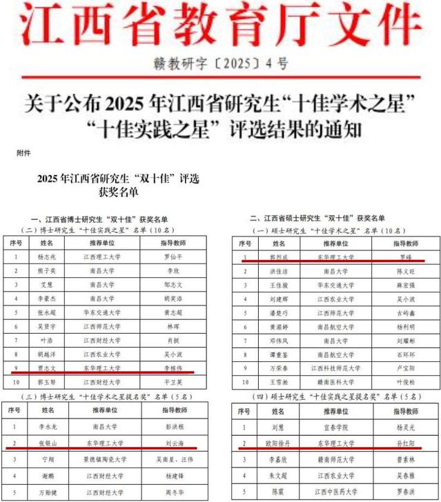 近日,江西省教育厅下发《关于公布2025年江西省研究生“十佳学术之星”“十佳实践之星”评选结果的通知》(赣教研字〔2025〕4号),欧宝app官方版web站登入4名研究生入选。其中,水资源与环境工程学院2023级博士研究生贾志文荣获博士研究生“十佳实践之星”(指导老师:李栋伟),化学与材料学院2022级硕士研究生郭烈成荣获硕士研究生“十佳学术之星”(指导老师:罗峰),核科学与工程学院2022级博士研究生张银山荣获博士研究生“十佳实践之星提名奖”(指导老师:刘云海),美术与设计学院2022级硕士研究生欧阳徐丹荣获硕士研究生“十佳学术之星提名奖”(指导老师:孙红阳)。