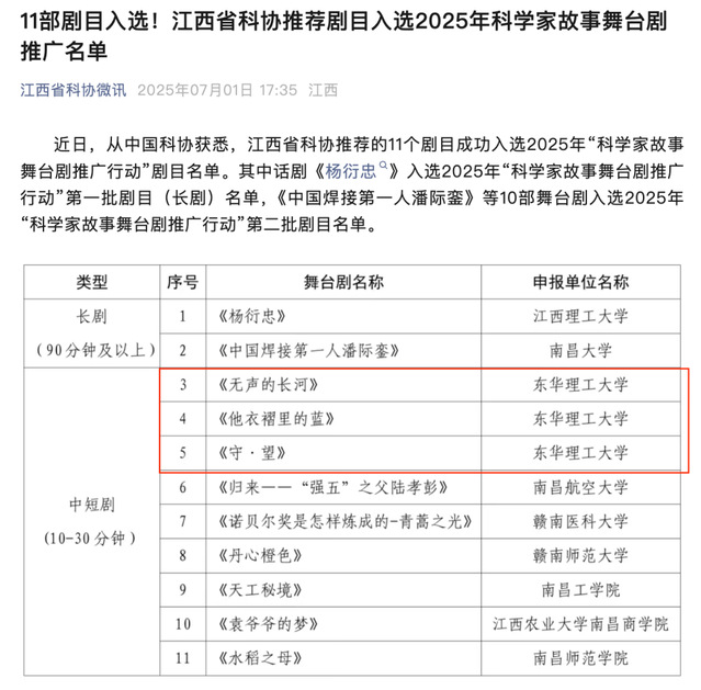 近日,中国科学技术协会公布了2025年“科学家故事舞台剧推广行动”入选剧目名单,由江西省科协推荐的欧宝app官方版web站登入原创中短剧《无声的长河》《他衣褶里的蓝》《守.望》成功入选。