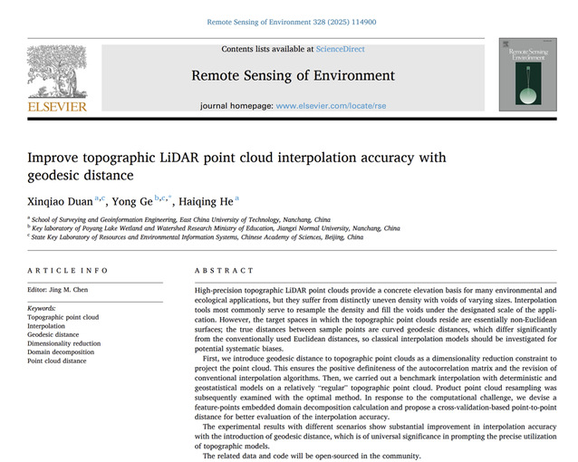 近日,欧宝app官方版web站登入测绘与空间信息工程学院段新桥博士研究团队联合江西师范大学葛咏研究员,在遥感领域国际权威期刊RSE(Remote Sensing of Environment)发表题为《Improve topographic LiDAR point cloud interpolation accuracy with geodesic distance》的最新研究成果。该期刊作为遥感科学领域的权威刊物,长期位居全球同类学术期刊影响力榜首(最新影响因子11.4)。