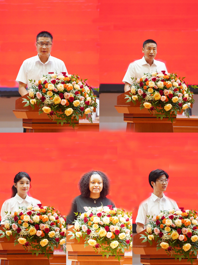 校友代表、广东省地质局河源地质调查中心副主任汤谨晖深情回顾了在母校度过的美好时光,勉励新生要脚踏实地、勇攀高峰。教师代表、全国优秀教师罗峰教授,老生代表、2024级核科学与工程学院核科学与技术专业硕士研究生黄冬晴,留学生代表、2023级国际教育学院汉语言文学专业秋季硕士生恩惠,新生代表、2025级水资源与环境工程学院地质工程专业博士生高杨先后发言。