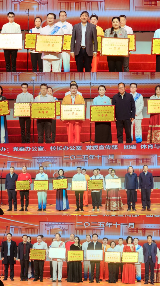 11月13日晚,欧宝app官方版web站登入“匠心筑梦 师声嘹亮”2025年教职工大合唱比赛在南昌青岚校园活动中心举行。校党政领导班子成员罗仙平、夏菲、杨波、熊国保、李满根、张立亭、刘剑斌、金建华出席。学校各职能部门、各学院师生代表1100余人到场观看演出。