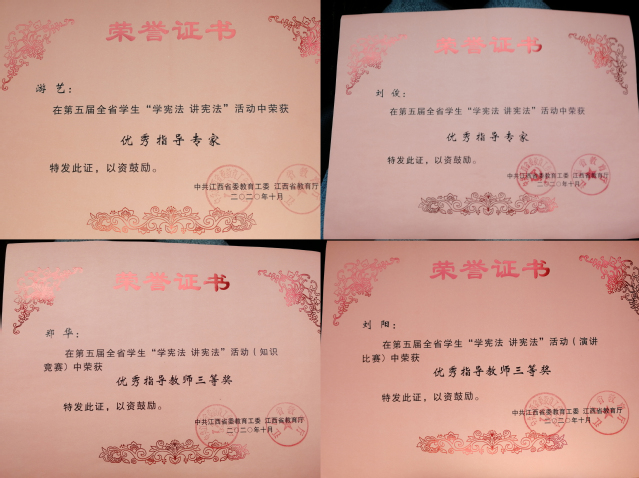 近日,江西省教育厅组织的第五届全省学生“学宪法 讲宪法”系列活动评选结果揭晓,共有4所高校获得最佳组织奖,3位老师获得“优秀指导专家”荣誉称号。其中,我校荣获了高校组最佳组织奖,文法学院游艺博士和刘俊教授获评“优秀指导专家、郑华博士和刘阳老师获评“优秀指导教师三等奖、邵睿博士荣获由教育部全国教育普法领导小组办公室授予的“一等奖指导教师奖”。
