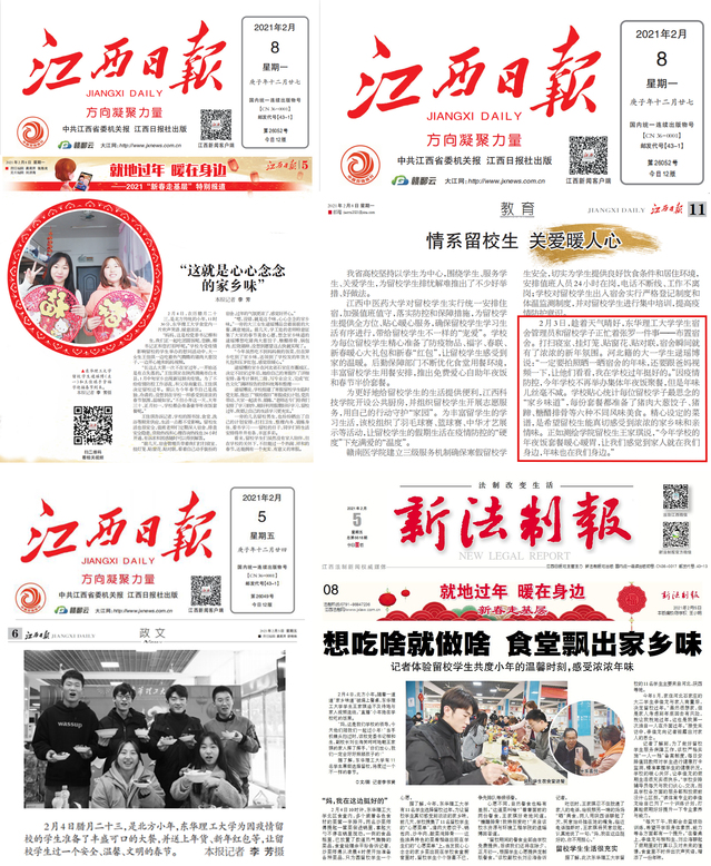 编者按:2月4日,是北方农历小年,我校暖意浓浓。留校学生们和宿舍管理员一起打扫卫生、挂灯笼、贴窗花,将寝室装扮一新。这些留校学生家乡多在北方地区。学校给每一位因为疫情留校的学生送上了新年大礼包以及压岁红包,11名留校学生在校领导的陪伴下,一起享用了定制版的年夜饭。中国教育电视台、学习强国、江西日报、新法制报、江西教育电视台、江西新闻、手机江西台等媒体对此进行报道,现将相关内容转载如下: