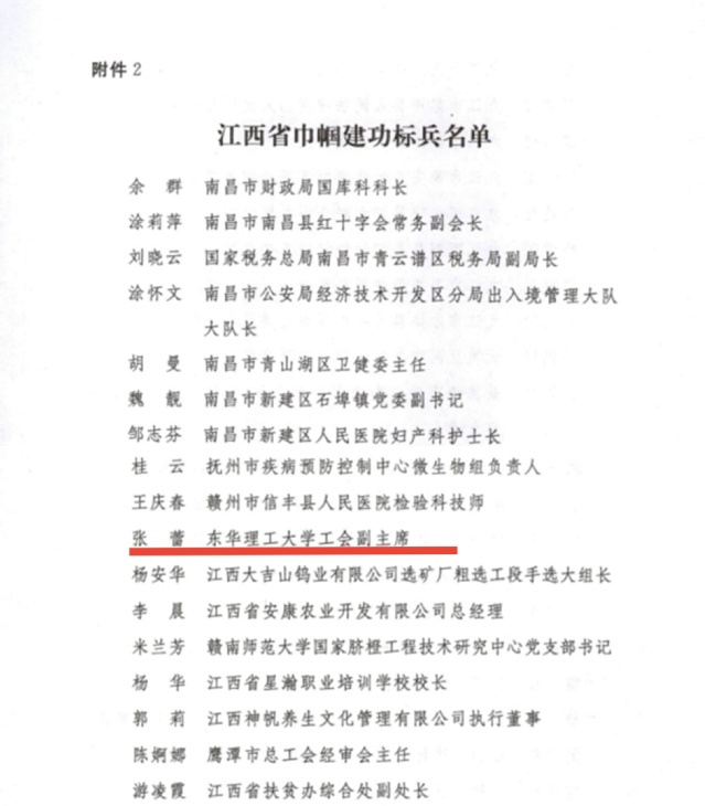 “三八”国际劳动妇女节前夕,从江西省妇女联合会传来喜讯,在全省城乡妇女岗位建功活动中,我校张蕾同志被授予江西省“巾帼建功标兵”荣誉称号。