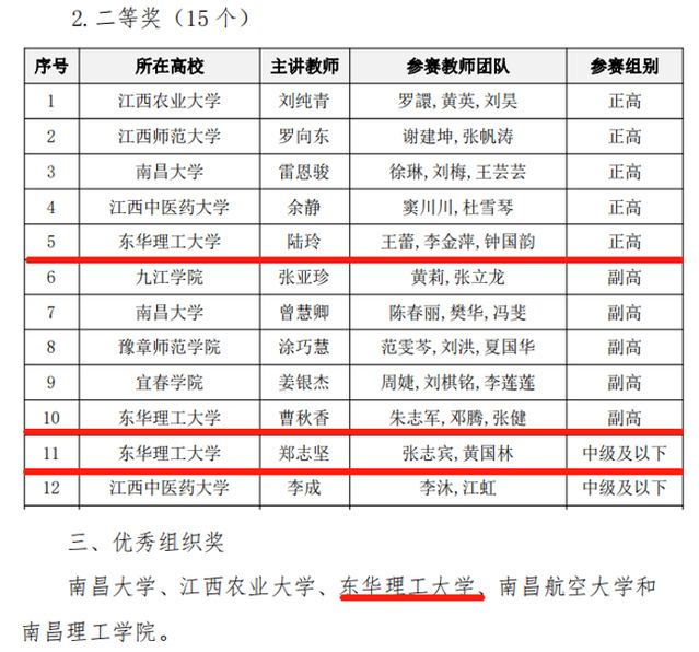 近日,首届江西省高校教师教学创新大赛决赛在南昌大学落下帷幕,我校选派的三个教师团队在众多参赛教师团队中脱颖而出。其中,信工学院的陆玲团队获得正高组二等奖,地科学院的曹秋香团队获得副高组二等奖,化生材学院的郑志坚团队获得中级及以下组二等奖。我校亦获得优秀组织奖。