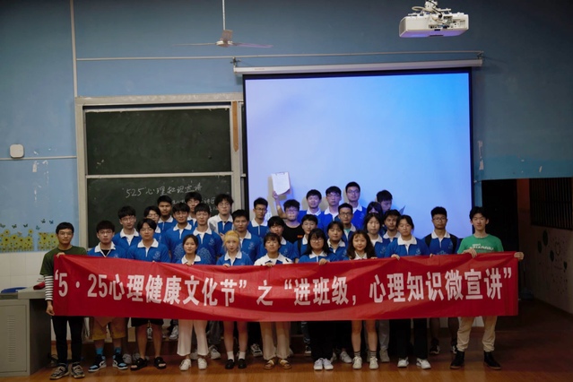 大学生心理健康教育宣讲团成员精心准备了心理小知识、心理小故事、心理小游戏,开展“进班级,送心知,心育人”科普宣传活动,为同学们揭开心理学的“神秘面纱”,搭建了解心理知识的平台。“同学们,你们知道5月25日是什么节日吗?”伴随着宣讲员们的发问,同学们纷纷进入心理知识大门,参与其中,宣讲氛围一下子活跃了起来。 “5·25”是“我爱我”的谐音,旨在提醒广大学生关爱自我、了解自我、接纳自我,关注自己的心理健康和心灵成长,提高自身心理素质,进而爱别人、爱社会。随后,一段幽默风趣的“脱口秀”在讲台上上演,通过身边的事例,向同学们介绍了吊桥效应、皮格马利翁效应、木桶效应等心理知识。最后,宣讲员介绍了后续心理健康系列活动以及5·25活动主战场,让同学们充分参与到心理健康月活动中来。