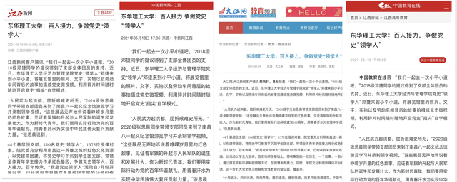“小岗破冰,深圳兴涛,海南弄潮,浦东逐浪,雄安扬波。改革开放浪潮浩荡,中国号巨轮坚定航向,闯险滩、战激流,开足马力、劈波斩浪,胜利驶入崭新而宽广的天地。”“国家的需要就是我们的努力方向,我们要将大庆精神与东华理工独特的核军工精神结合起来,对国家讲奉献、对社会讲担当、对人民讲情义,以强烈的使命担当创造属于我们这一代人的辉煌。”……每一个领学视频都是一堂生动的党史微团课,学生讲述历史的同时也在触摸历史。领学活动中,学生深入到南昌本地党史资源中充分挖掘细节,把身边的红色资源活化为能看、能听的文化产品和精神食粮。