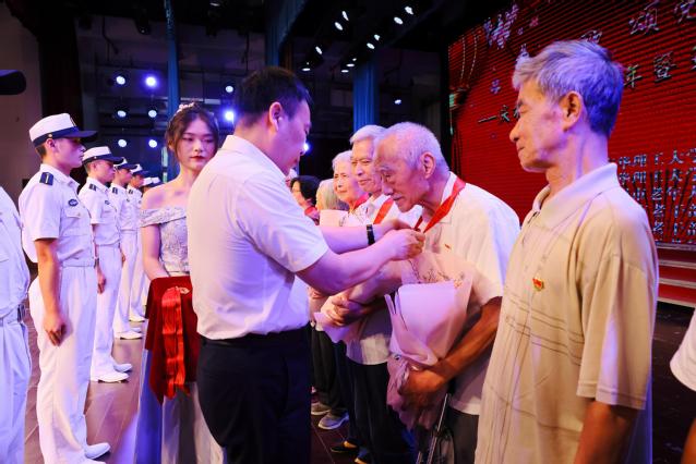演出期间还举行了“光荣在党50年”纪念章颁发仪式。来到现场的20名老党员代表,相互搀扶着,手拉手登上舞台。在欢快的音乐声中,校党委副书记刘紫春一一为老党员颁发纪念章并献花,以感谢老党员对党的事业、对学校的发展作出的突出贡献。老党员们站在台上,佩戴着纪念章,手捧着鲜花,显得格外精神焕发,传递满满的正能量。现场观众的掌声久久没有停息,这是对老党员最好的祝福,这一时刻将联欢会推向了**。