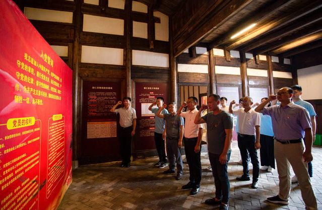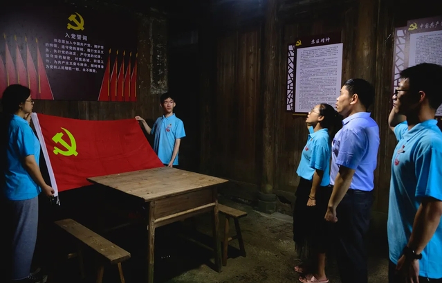 重温入党誓词,坚定奋斗初心。收看庆祝大会后,校团委赴崇仁县徐家村志愿服务队、测绘工程学院志愿服务队师生冒雨来到崇仁县第一个党支部——古塘支部旧址,在讲解员的带领下,与学校驻村工作队及徐家村村委会党员干部共同参观学习,深入了解崇仁县第一个党支部的创建过程。聆听老一辈无产阶级革命家在崇仁宣传革命道理、播撒革命火种、开展革命斗争的感人故事。在旧址展厅里,校地双方党员干部、教师党员、学生党员面向党旗,共同高举右拳重温入党誓词,大家神情庄重、声音铿锵,彰显了共产党员始终不渝的初心和为共产主义奋斗终身的信念。校团委赴资溪志愿服务队党员师生们怀着敬仰之情,克服了暴雨积水、山路崎岖等困难,历经两个多小时的行程,来到闽赣第一个党支部成立基地——下张党支部旧址参观学习。一张张照片、一行行文字,让师生们接受了一场震撼心灵的精神洗礼。面对着鲜艳的党旗,全体党员情不自禁举起右拳重温入党誓词。土木与建筑工程学院志愿者们在永修县档案馆观摩红色画展,学习了解张朝燮等革命先辈在大革命失败后回到老家永修继续开展革命工作的故事。在“为人民服务”石碑前,全体学生党员高举右拳,重温入党誓词,回顾入党初心。
