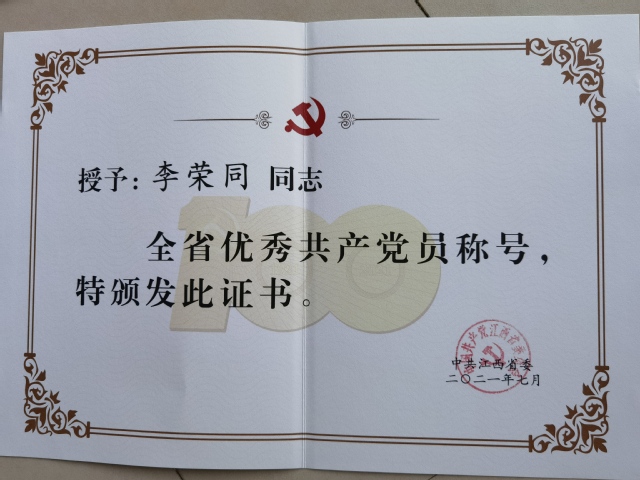 在庆祝建党100周年之际,为表彰先进、弘扬正气,激励全省各级党组织和广大党员奋发有为、建功立业,中共江西省委印发《中共江西省委关于表彰全省优秀共产党员、全省优秀党务工作者和全省基层党组织的决定》(赣委〔2021〕307号),分别授予200名共产党员、99名党务工作者和99个基层党组织“全省优秀共产党员”“全省优秀党务工作者”及“全省先进基层党组织”称号。我校李荣同教授荣获“全省优秀共产党员”荣誉称号,并作为“全省优秀共产党员”代表参加了江西省庆祝中国共产党成立100周年大会。