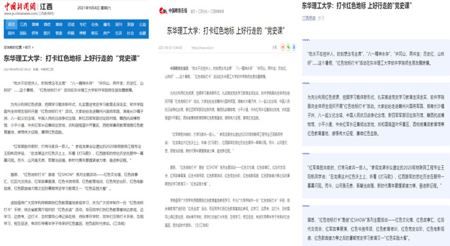 编者按:为充分利用红色资源,挖掘学习载体新形式,扎实推进党史学习教育走深走实,我校软件学院面向全院师生组织开展“红色地标打卡”活动。中国新闻网、中国教育在线、江西思政、凤凰网、大江网、今日头条等媒体对此进行报道,现将相关内容转载如下: