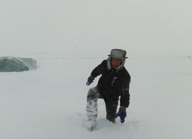 周义朋冒着大雪在野外开展科学试验