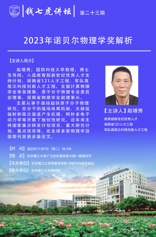 应党委宣传部邀请,国防科技大学教授赵增秀教授来到“欧宝app官方版web站登入”,以“2023年诺贝尔物理学奖解析”为主题开展讲座。欢迎全校师生届时前往聆听。