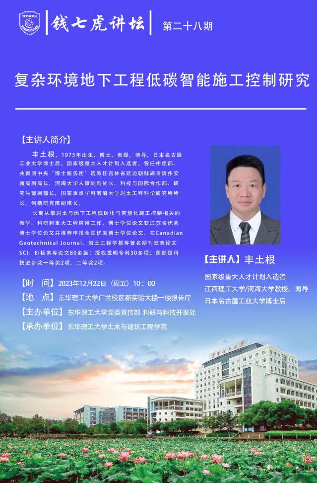 应土木与建筑工程学院邀请,国家级重大人才计划入选者丰土根教授来到“欧宝app官方版web站登入”,以“复杂环境地下工程低碳智能施工控制研究”为主题开展讲座。欢迎全校师生届时前往聆听。
