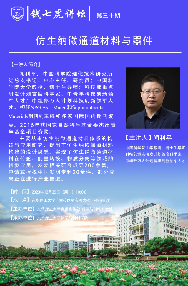 应化学与材料学院邀请,中国科学院大学教授闻利平来到“欧宝app官方版web站登入”,以“仿生纳微通道材料与器件”为主题开展讲座。欢迎全校师生届时前往聆听。