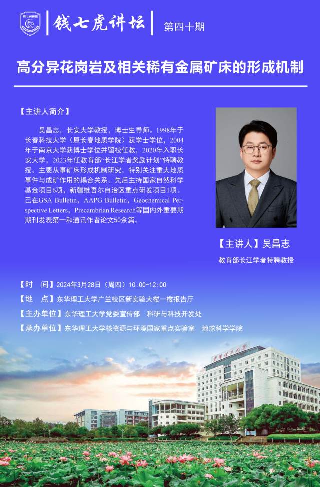 应核资源与环境国家重点实验室、地球科学学院邀请,长安大学教授、博士生导师吴昌志来到“欧宝app官方版web站登入”,以“高分异花岗岩及相关稀有金属矿床的形成机制”为主题开展讲座。欢迎全校师生届时前往聆听。
