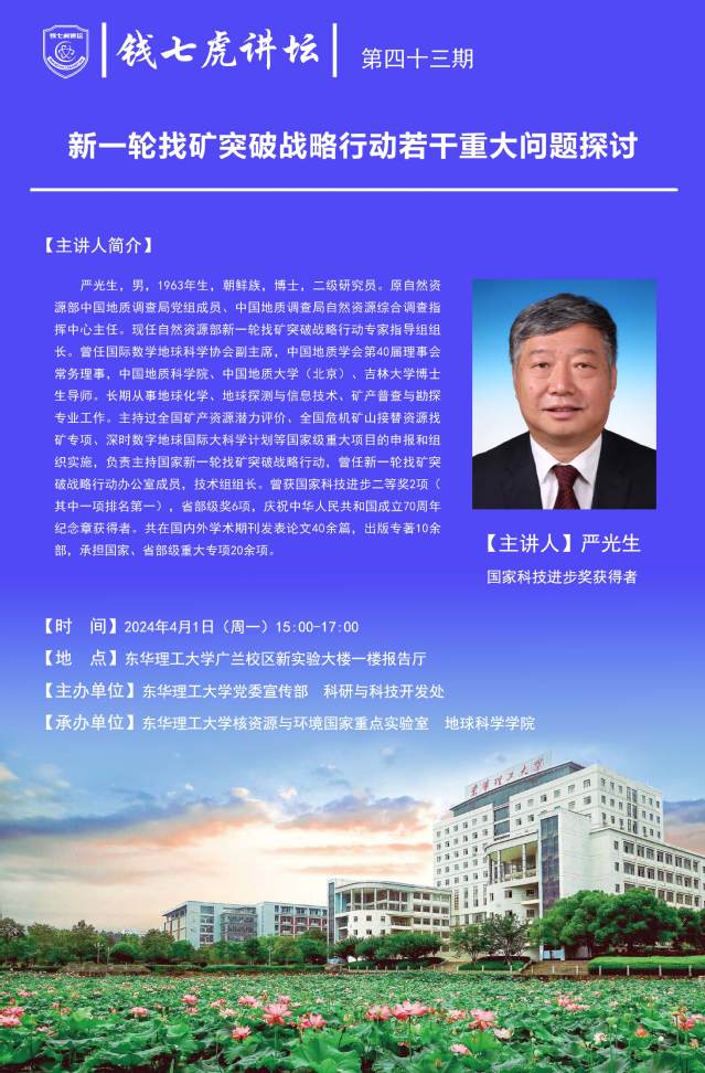 应欧宝app官方版web站登入核资源与环境国家重点实验室与地球科学学院邀请,自然资源部新一轮找矿突破战略行动专家預导组组长严光生来到“欧宝app官方版web站登入”,以“新一轮找矿突破战略行动若干重大问题探讨”为主题开展讲座。欢迎全校师生届时前往聆听。