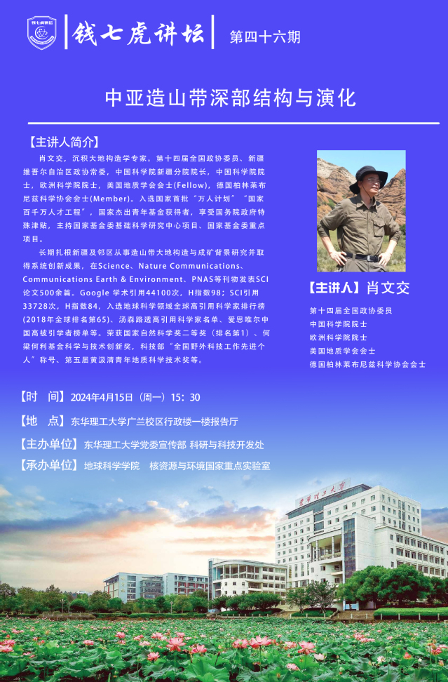 应地球科学学院、核资源与环境国家重点实验室邀请,中国科学院院士肖文交到“欧宝app官方版web站登入”,以“中亚造山带深部结构与演化”为主题开展讲座。欢迎全校师生届时前往聆听。