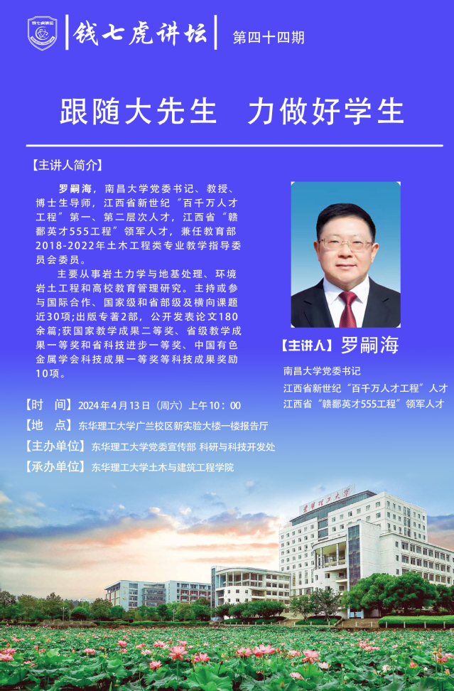 应土木与建筑工程学院邀请,南昌大学党委书记、江西省新世纪“百千万人才工程”第一、第二层次人才罗嗣海到“欧宝app官方版web站登入”,以“跟随大先生力做好学生”为主题开展讲座。欢迎全校师生届时前往聆听。