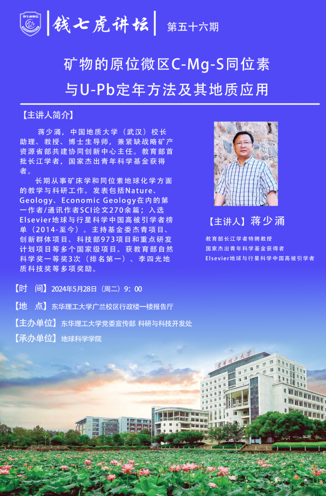 应地球科学学院邀请,国家级人才蒋少涌到“欧宝app官方版web站登入”,以“矿物的原位微区C-Mg-S同位素与U-Pb定年方法及其地质应用”为主题开展讲座。欢迎全校师生届时前往聆听。
