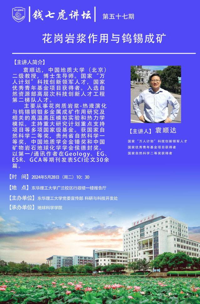 应地球科学学院邀请,国家级人才袁顺达到“欧宝app官方版web站登入”,以“花岗岩浆作用与钨锡成矿”为主题开展讲座。欢迎全校师生届时前往聆听。