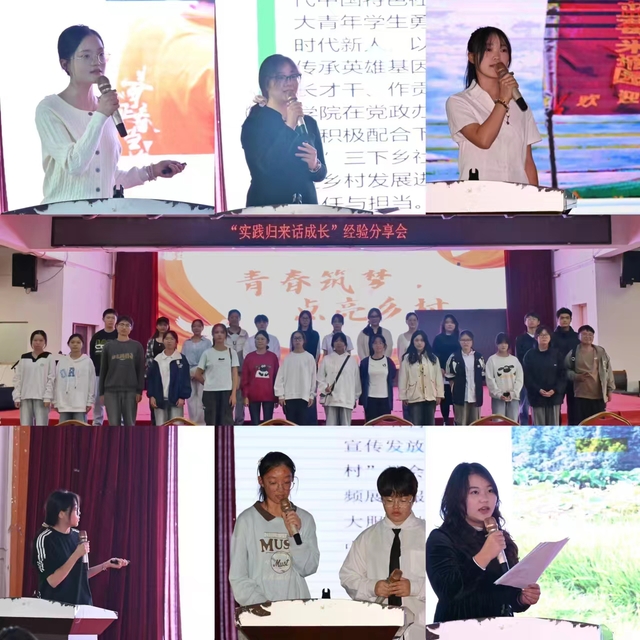 核科学与工程学院的实践队员讲述了“赣核青年”实践队给村民们科普核科学知识,让村民们了解“核”在“农”上应用的故事;地球物理与测控技术学院的实践队员向同学们讲述他们如何发挥专业特长,科学助农,为堤坝做“CT”;美术与设计学院的实践队员分享了“美好青春”实践队通过“美育”与红色文化结合的形式,让红色精神与文化自信深入人心的实践经历;校团委和文法与艺术学院共同组建的“普惠乡村”社会实践队队员分享了他们团队跨越数千公里,前往新疆阿克陶县开展社会实践的精彩经历。此外,土木与建筑工程学院、经济管理学院、信息工程学院、理学院等多支学院实践队的分享人,向现场观众逐一讲述了他们的实践经历。