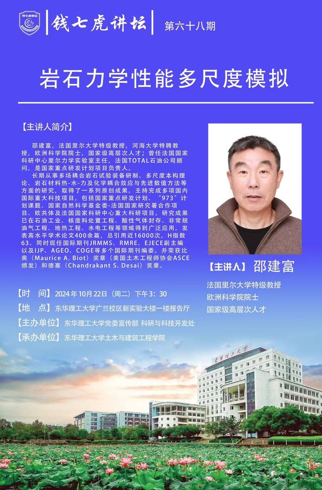 应土欧宝app官方版web站登入木与建筑工程学院邀请,法国里尔大学特级教授,河海大学特聘教授,欧洲科学院院士,国家级高层次人才邵建富到“欧宝app官方版web站登入”,以“岩石力学性能多尺度模拟”为主题开展讲座。欢迎全校师生届时前往聆听。