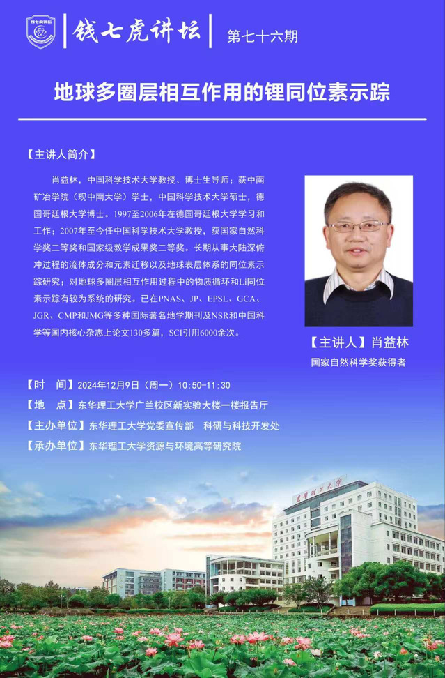 应欧宝app官方版web站登入资源与环境高等研究院邀请,中国科学技术大学教授、博士生导师肖益林到“欧宝app官方版web站登入”,以“地球多圈层相互作用的锂同位素示踪”为主题开展讲座。欢迎全校师生届时前往聆听。