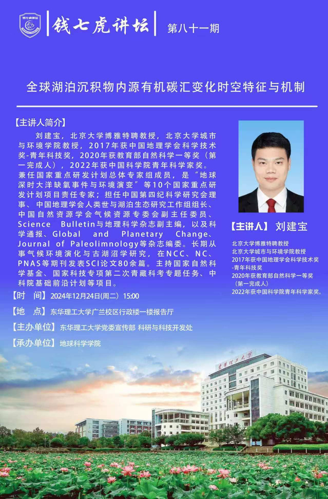 应地球科学学院邀请,北京大学博雅特聘教授,北京大学城市与环境学院教授刘建宝到“欧宝app官方版web站登入”以“全球湖泊沉积物内源有机碳汇变化时空特征与机制”为主题开展讲座。欢迎全校师生届时前往聆听。