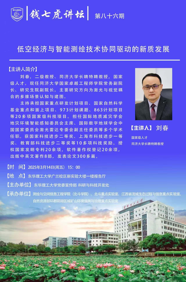 应测绘与空间信息工程学院(北斗学院)、北斗重点实验室、江西省流域生态过程与信息重点实验室、自然资源部环鄱阳湖区域矿山环境监测与治理重点实验室邀请,二级教授、国家级人才、同济大学长聘特聘教授、现任同济大学国家卓越工程师学院常务副院长、研究生院副院长刘春到“欧宝app官方版web站登入”,以“低空经济与智能测绘技术协同驱动的新质发展”为主题开展讲座。欢迎全校师生届时前往聆听。
