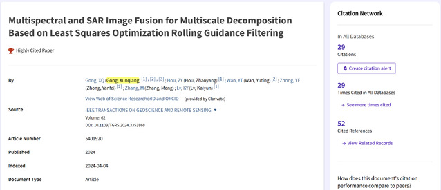 近日,欧宝app官方版web站登入测绘与空间信息工程学院龚循强副教授团队联合武汉大学钟燕飞教授团队在遥感领域国际权威期刊《IEEE Transactions on Geoscience and Remote Sensing》(中科院一区TOP)发表的论文“Multispectral and SAR Image Fusion for Multiscale Decomposition Based on Least Squares Optimization Rolling Guidance Filtering”被遴选为ESI数据库高被引论文,其被引频次已进入地球科学(Geosciences)学术领域前1%。