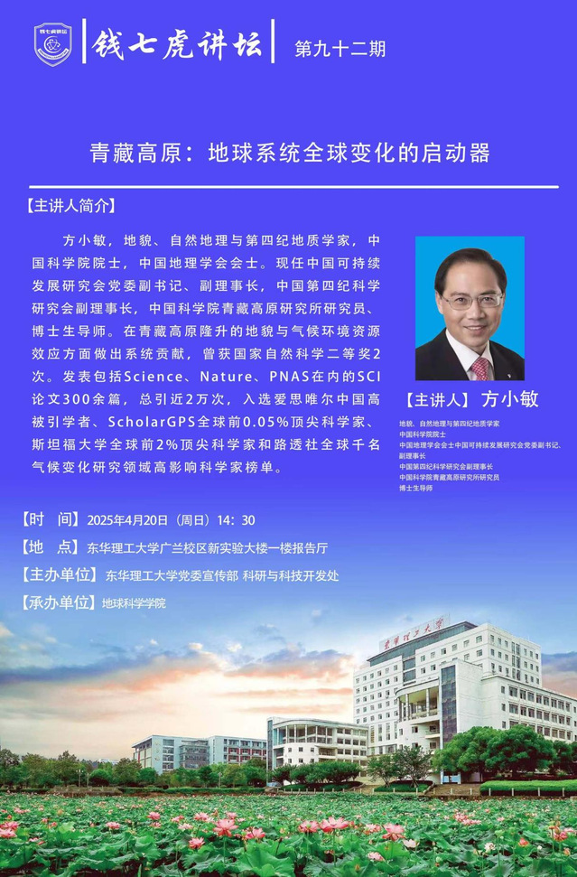 应地球科学学院邀请,中国科学院院士,中国地理学会会士方小敏到“欧宝app官方版web站登入”,以“青藏高原:地球系统全球变化的启动器”为主题开展讲座。欢迎全校师生届时前往聆听。