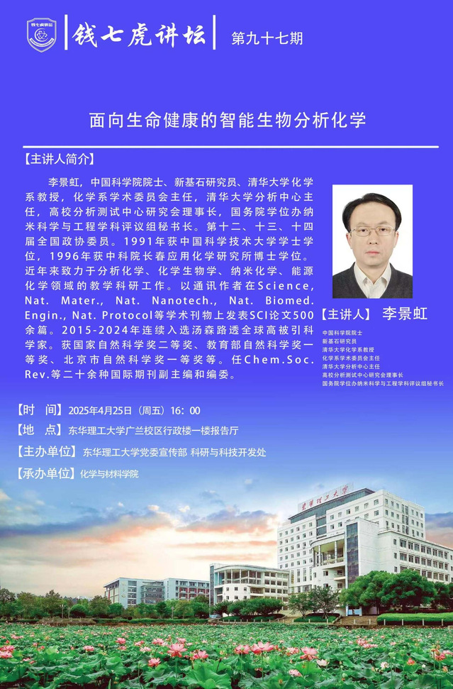 应欧宝app官方版web站登入化学与材料学院邀请,中国科学院院士、新基石研究员、清华大学化学系教授,化学系学术委员会主任,清华大学分析中心主任,高校分析测试中心研究会理事长,国务院学位办纳米科学与工程学科评议组秘书长李景虹到“欧宝app官方版web站登入”,以“面向生命健康的智能生物分析化学”为主题开展讲座。欢迎全校师生届时前往聆听。