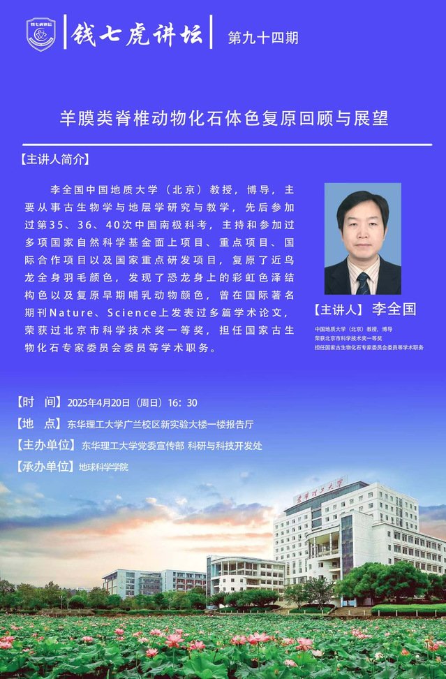 应地球科学学院邀请,中国地质大学(北京)教授,博导李全国到“欧宝app官方版web站登入”以“羊膜类脊椎动物化石体色复原回顾与展望”为主题开展讲座。欢迎全校师生届时前往聆听。