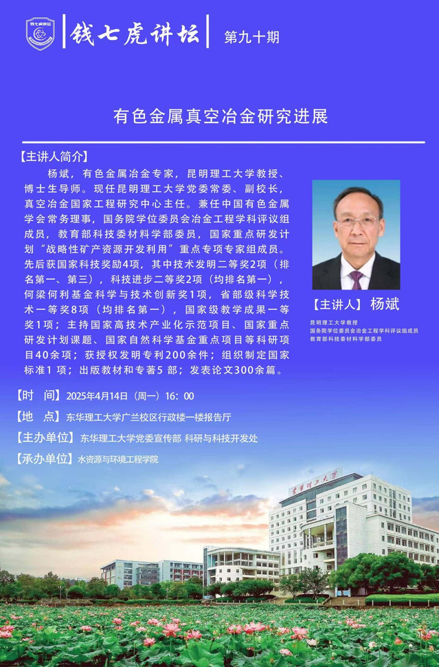 应水资源与环境工程学院邀请,昆明理工大学教授、博士生导师杨斌到“欧宝app官方版web站登入”以“有色金属真空冶金研究进展”为主题开展讲座。欢迎全校师生届时前往聆听。