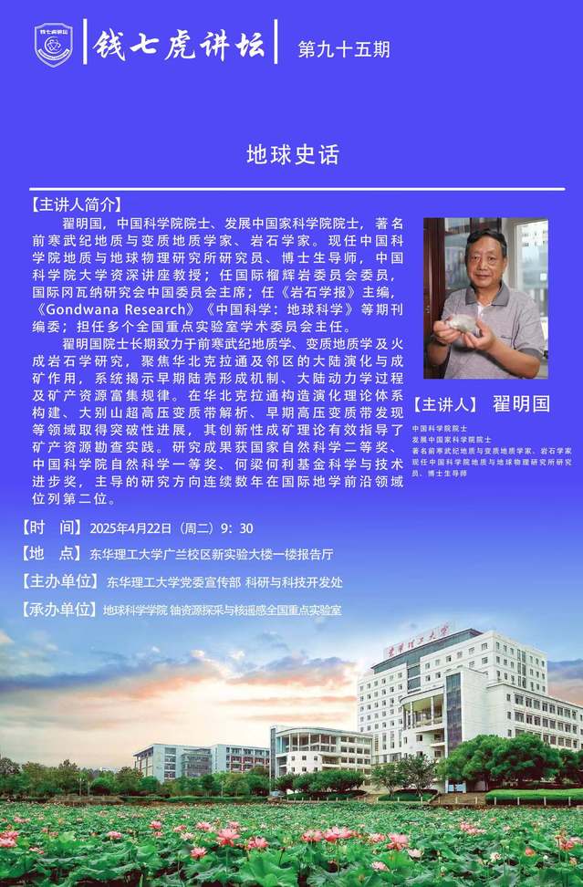 应地球科学学院、铀资源探采与核遥感全国重点实验室邀请,中国科学院院士翟明国到“欧宝app官方版web站登入”以“地球史话”为主题开展讲座。欢迎全校师生届时前往聆听。